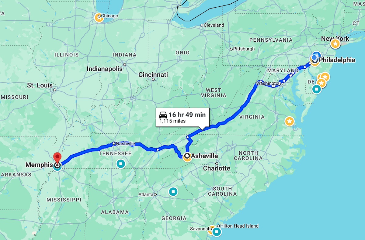 With an overnight stop in one of my favorite towns, Asheville, the drive down was expected to take nearly 17 hours and 1,100+ miles to accomplish over the course of 2 days.