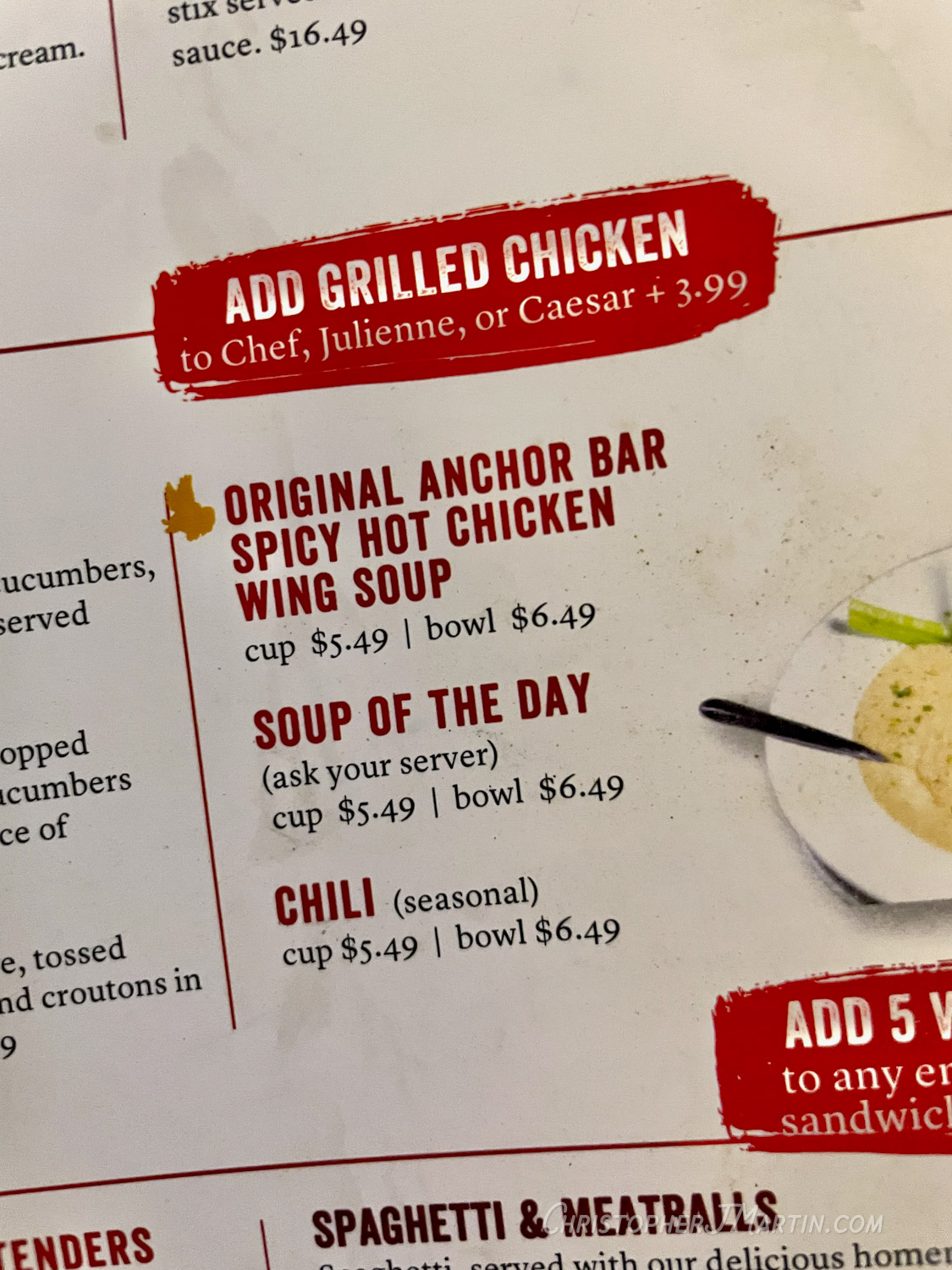 Bonus: Now, if you told me I would also discover and order something called the “Original Anchor Bar Spicy Hot Chicken Wing Soup”, which was a recommended menu item, I’m not sure I would have believed you! But I was not going to waste my chance.