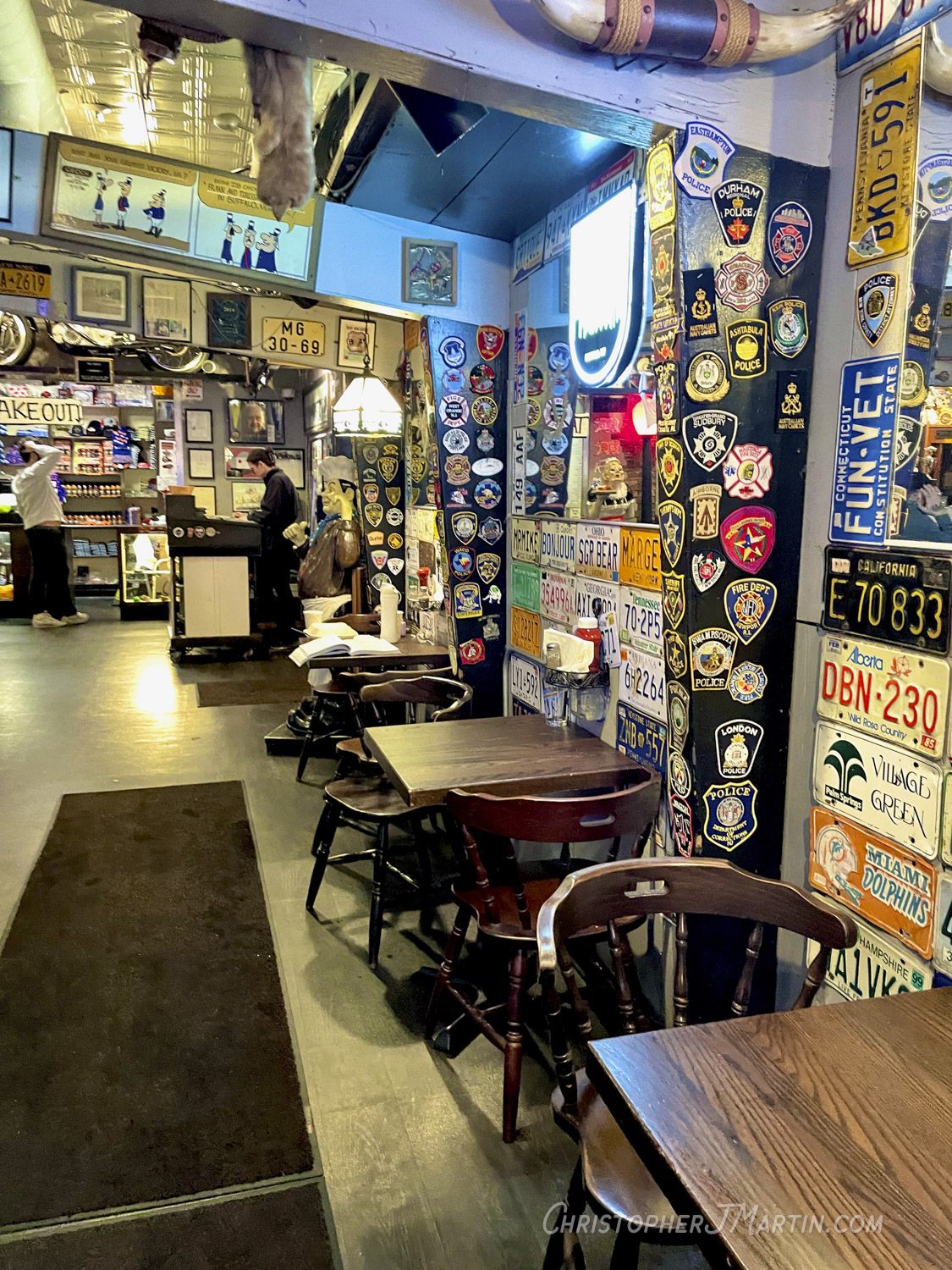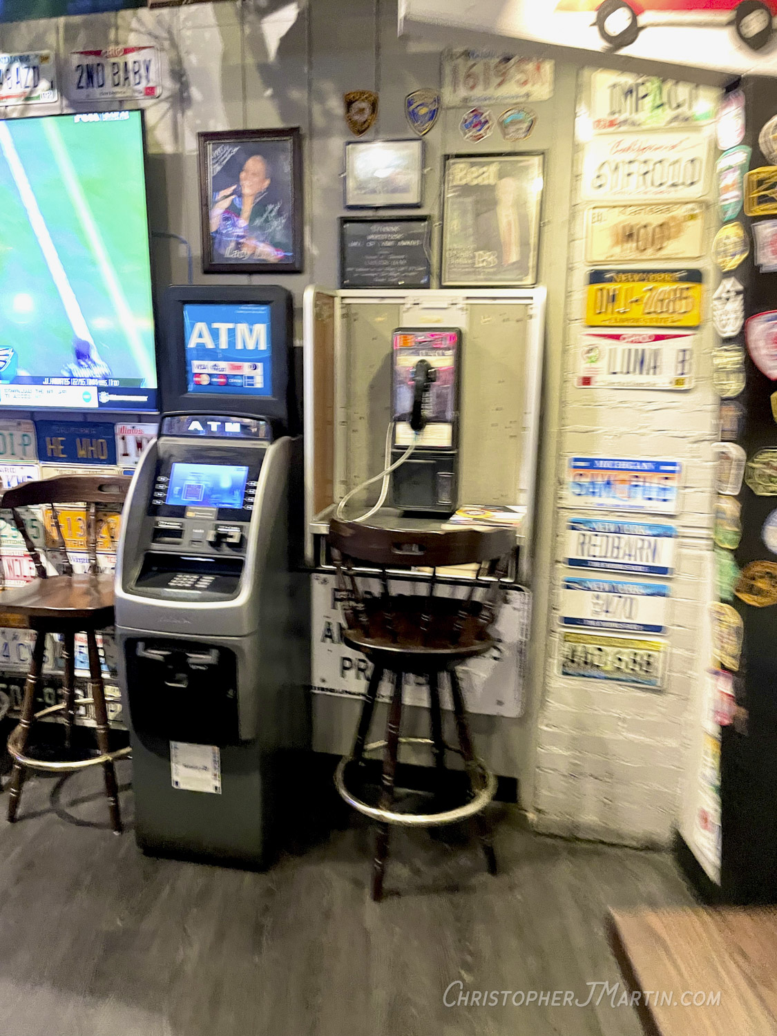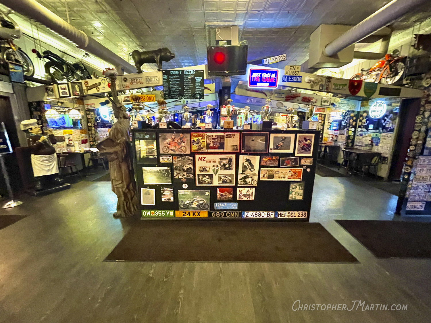 The inside continues to deliver with all sorts of interesting decor from ceiling-mounted motorcycles, license plates, figurines, awards, a pay phone and plenty of TVs. In addition to a small gift shop, I’m surprised to discover all sorts of hidden rooms, nooks and crannies. In the best way possible, the place is no-frills while also having lots of details and character.