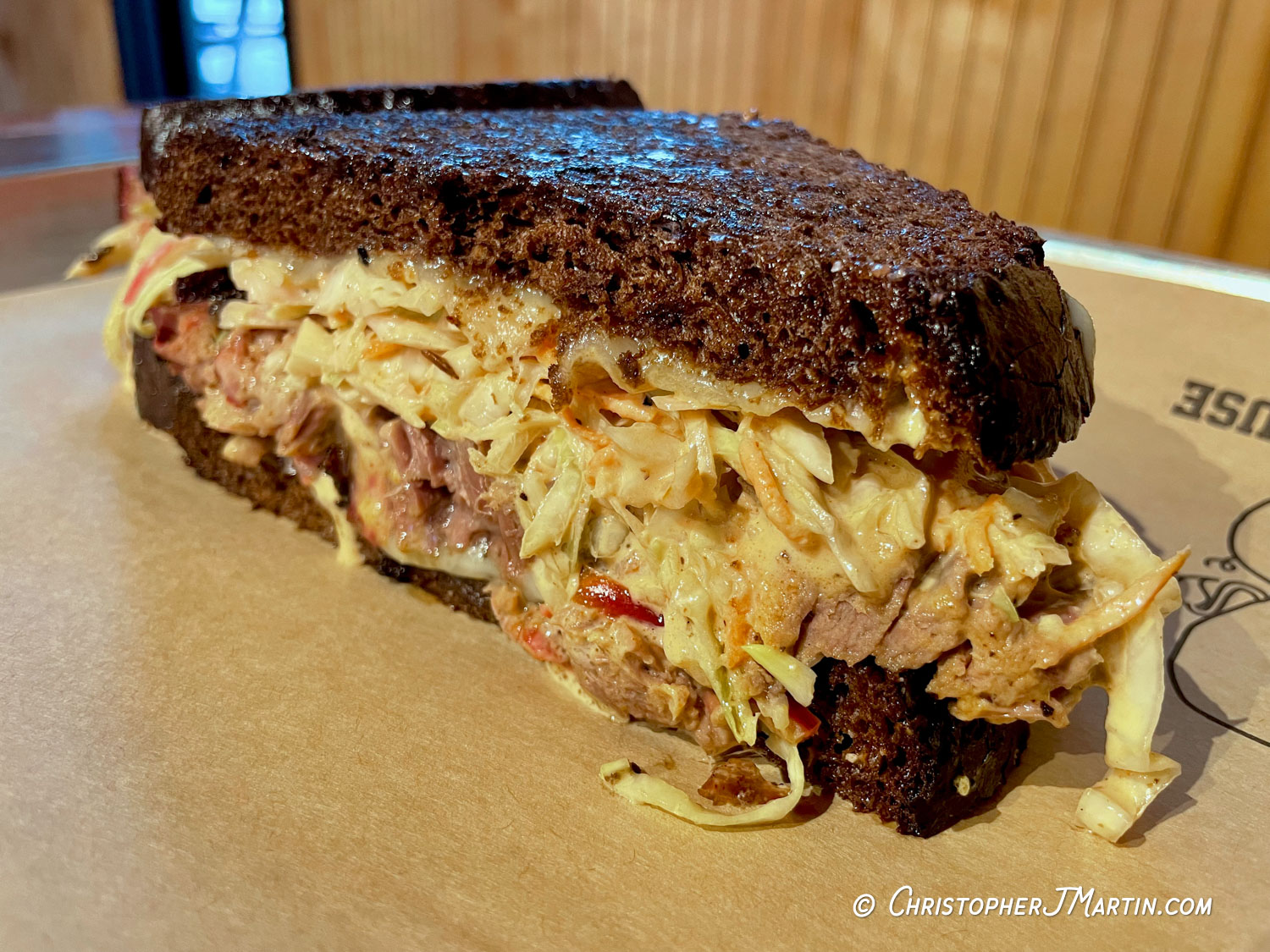 This sandwich features brisket, swiss cheese, cole slaw, and pickled rye sauce on honey wheat bread.