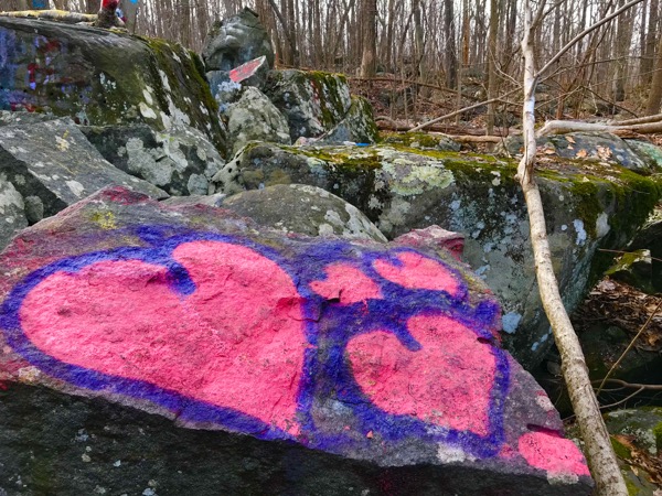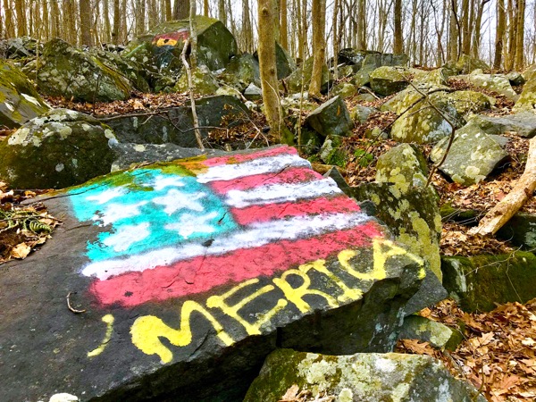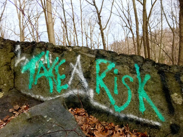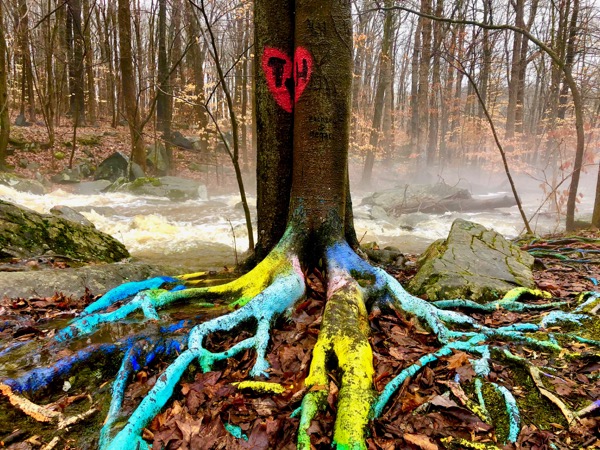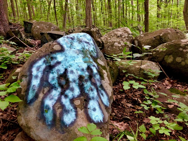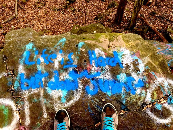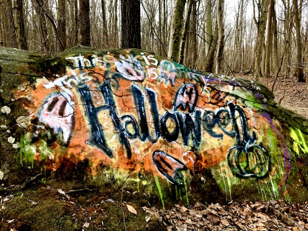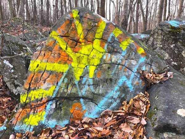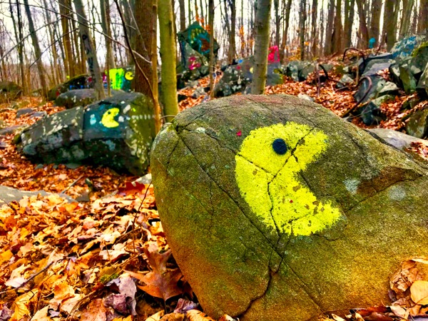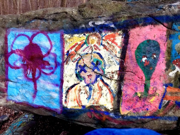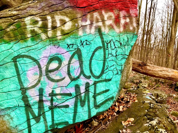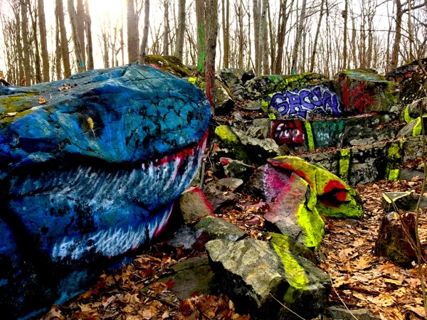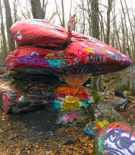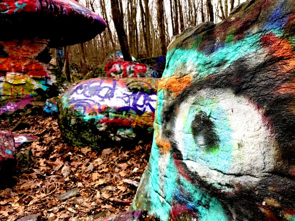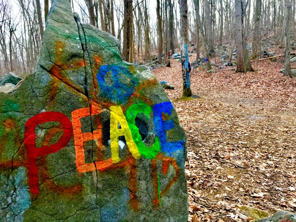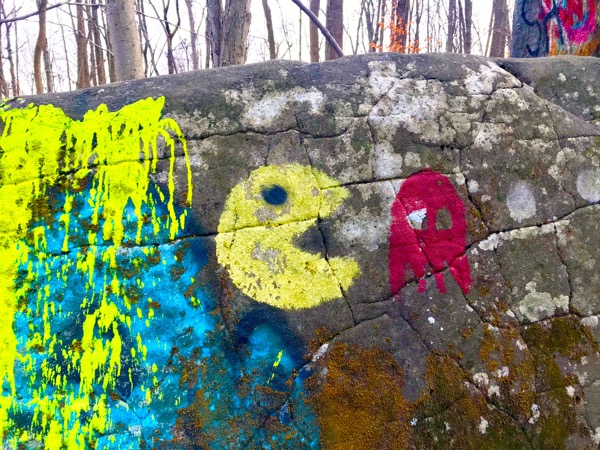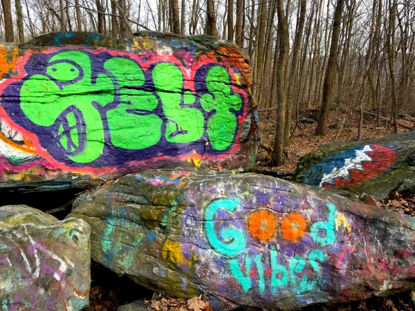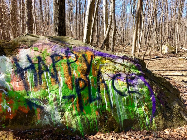 I pulled into a parking lot across from the small post office and discovered a set of trails through the state game lands. Consistent with the rest of the charm of the village, I discovered that the trails and nature surrounding St. Peters Village are uniquely decorated with unsanctioned (and apparently illegal) spray-paint art, including words and phrases of love, loss, encouragement and regret, clever designs and cartoonesque characters. I was fascinated.
